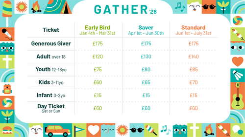 Book your tickets as early as possible to make sure you secure the best price. The pricing structure can be found below. Weekend prices include all food from dinner on Friday until lunch on Monday. If you can't make it for the whole weekend, Saturday and Sunday day tickets are available and include breakfast, lunch and dinner. If you can afford to spend a little more to help make Gather more affordable for others, we have a Generous Giver ticket available for £175.
